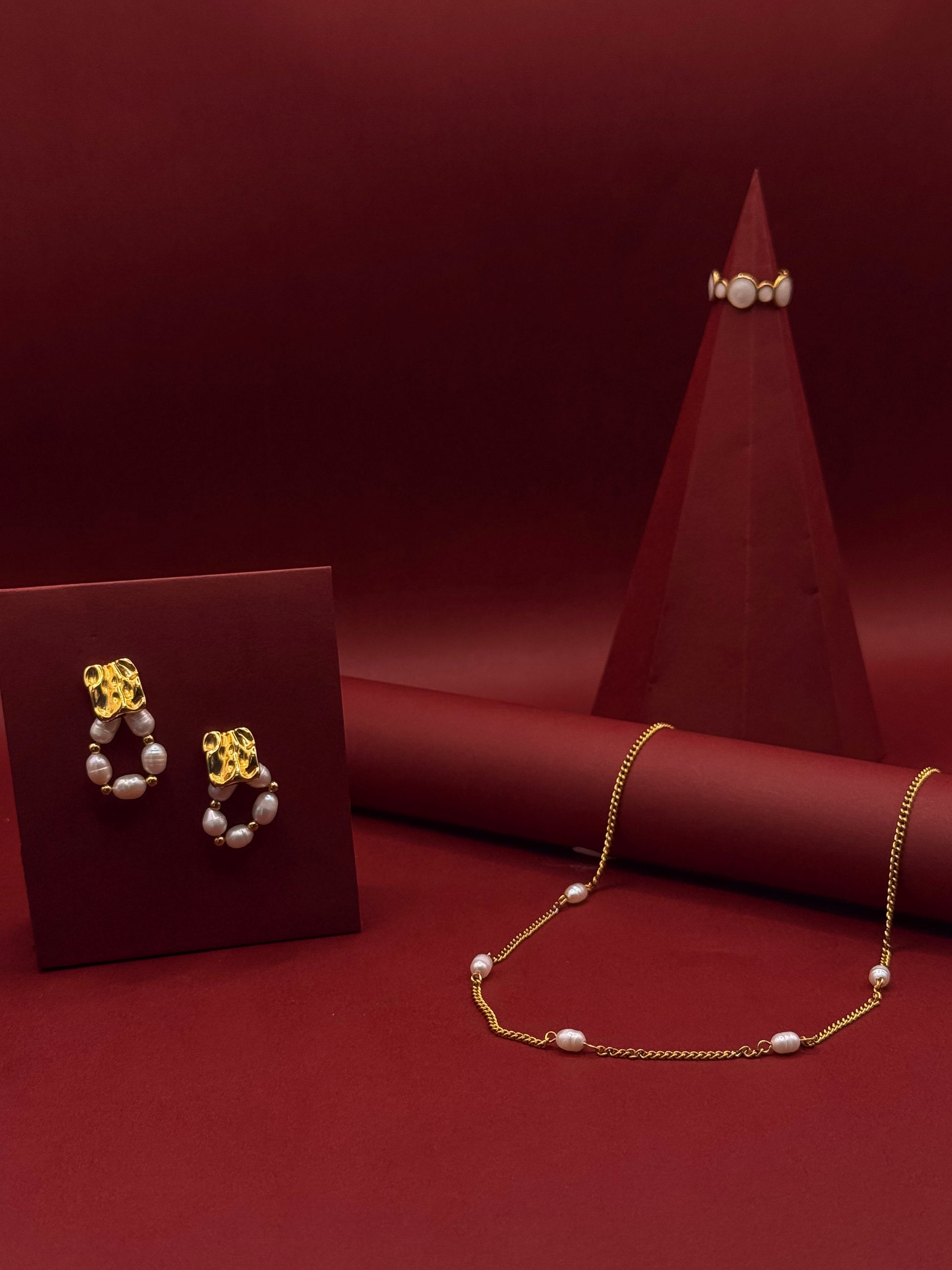 Lleva tu estilo al próximo nivel con el Set de aretes, anillo y collar de acero inoxidable 316L Nerissa. Dale un toque de elegancia a tu atuendo con los detalles de perlas.